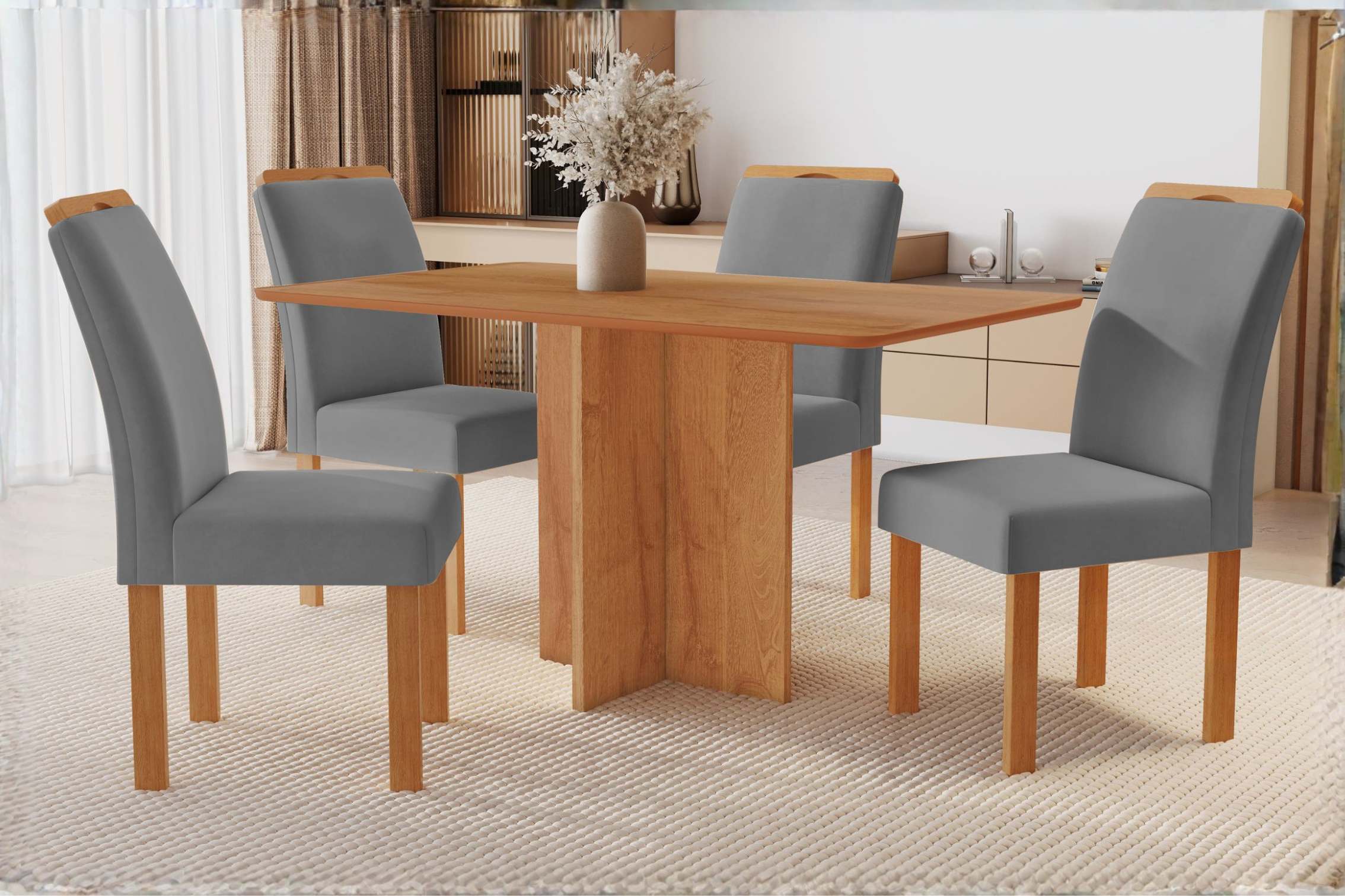 Conforto e elegância que transformam sua sala de jantar: cadeiras com espuma macia e estrutura resistente para momentos ainda mais agradáveis. A mesa com base robusta e tampo de cantos arredondados traz segurança, durabilidade e um design sofisticado. Perfeito para quem busca beleza, qualidade e aconchego em cada detalhe.