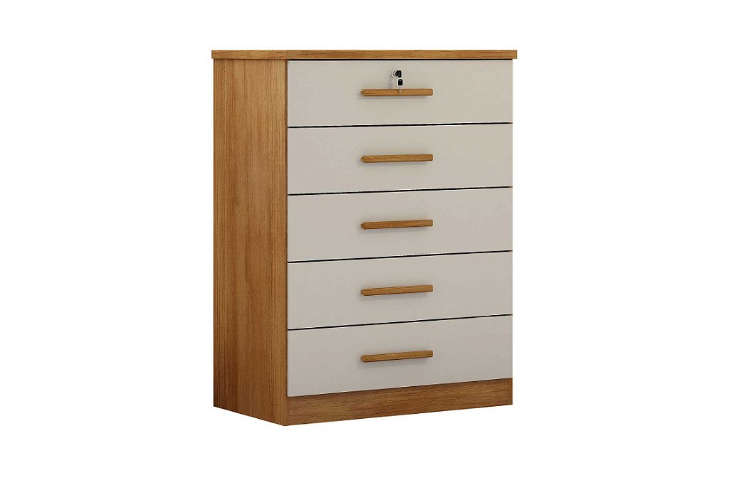 Descubra a elegância e funcionalidade da nossa cômoda com 5 gavetas, uma com chave para segurança extra. Perfeito para organizar seu espaço com estilo!