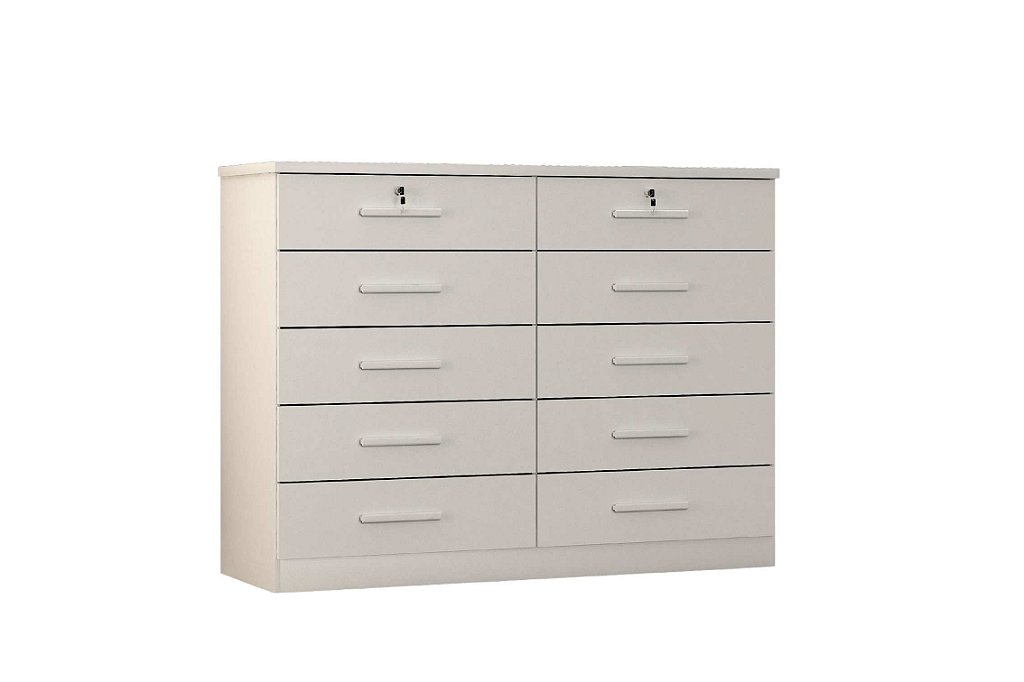 Cômoda com 10 gavetas espaçosas, sendo duas com chave para guardar itens com mais segurança. As gavetas são equipadas com corrediças telescópicas, que garantem abertura suave e maior durabilidade. Ideal para quem busca organização e praticidade no dia a dia.