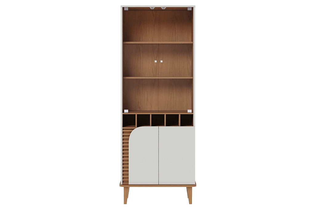 Cristaleira de luxo com 02 portas de vidro temperado, trazendo elegância e sofisticação para a sua casa. As portas de giro, uma delas com detalhe curvo, adicionam um toque de charme ao móvel. O detalhe ripado artesanal demonstra o cuidado e a qualidade do acabamento, tornando esta peça única e especial. Além disso, a adega embutida com capacidade para 05 garrafas proporciona praticidade e funcionalidade para os amantes de vinho.
