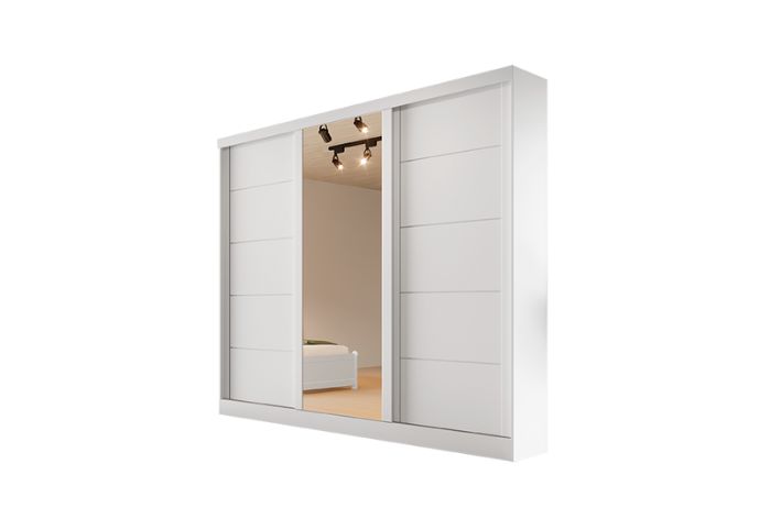 Guarda-roupa com estrutura 100% MDF, que une resistência e acabamento de alta qualidade. Possui 3 portas de correr, sendo a central com espelho e película de segurança, além de 4 gavetas com corrediças telescópicas para maior praticidade. Os puxadores em MDF e o cabideiro em alumínio com pintura UV completam o design funcional e elegante.