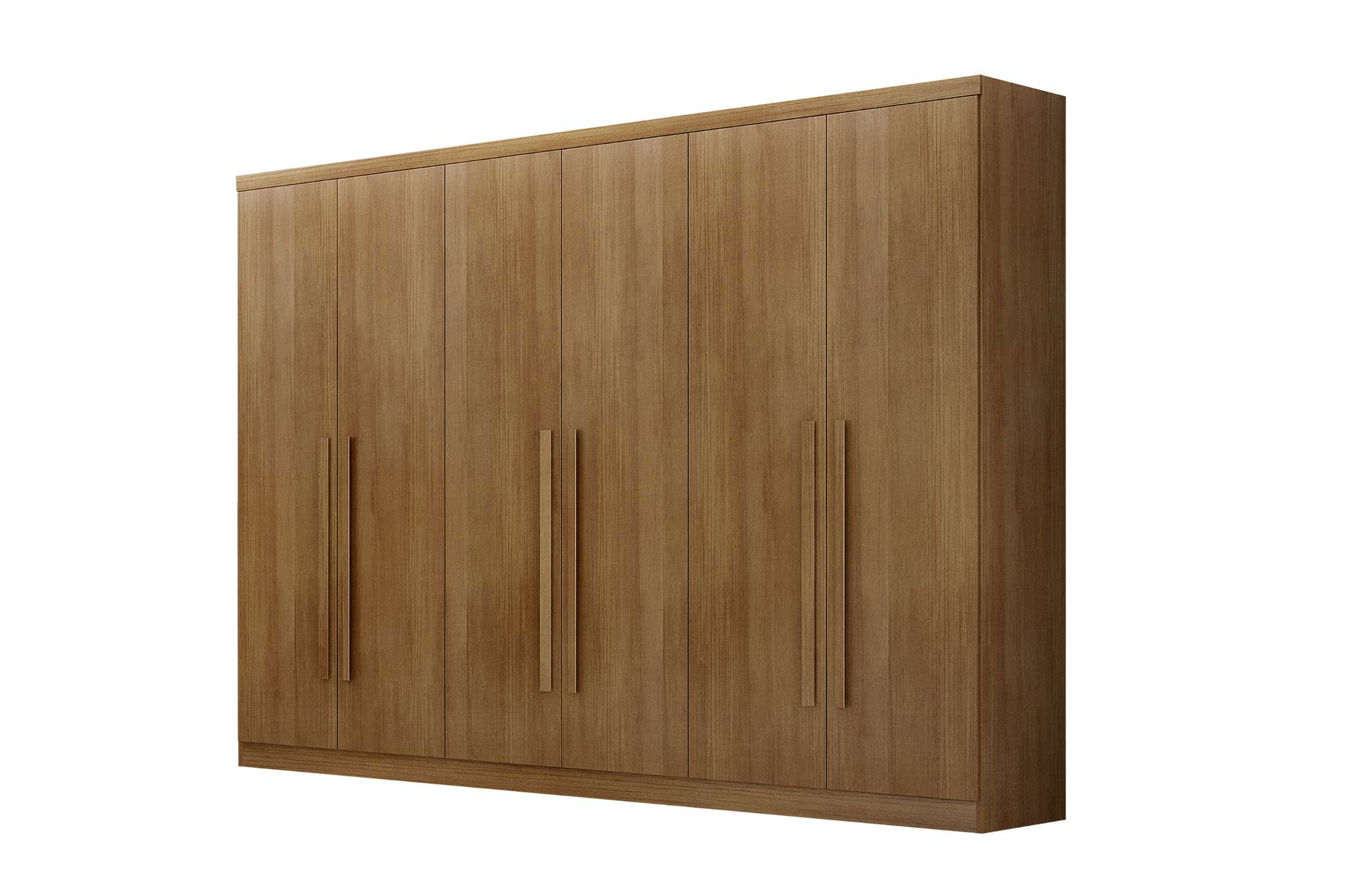 Guarda-roupa com excelente divisão interna, incluindo espaço “ele e ela” para mais organização no dia a dia, conta com puxadores com acabamento amadeirado e dobradiças de pressão 35mm que garantem praticidade e durabilidade, além de gavetas internas com corrediças telescópicas que proporcionam abertura suave e melhor aproveitamento do espaço.