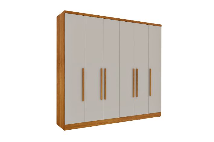 O Guarda Roupas 6 portas, oferece um interior amplo com divisões excelentes, para você organizar suas roupas de maneira fácil. Produto em MDP e Puxadores amadeirados com corrediças telescópicas, o cabideiro é em alumínio.