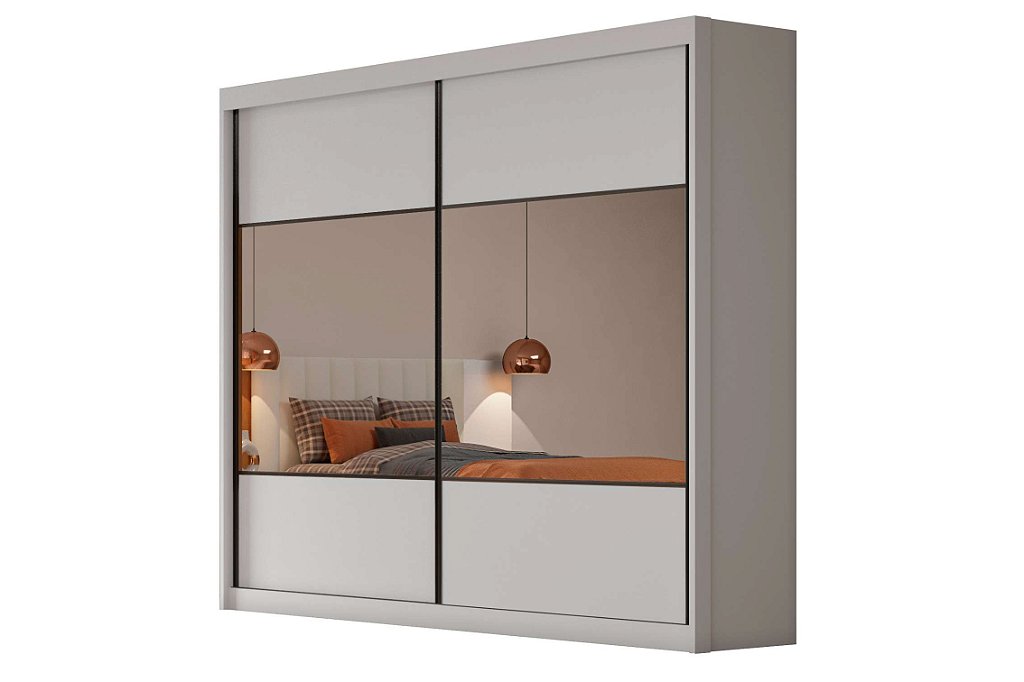 Guarda-roupa 100% MDF com estrutura reforçada e coluna central de 25mm, garantindo durabilidade e resistência. Conta com trilhos inferiores em alumínio e roldanas com amortecedor para um deslizamento suave das portas. Possui espaço Ele e Ela, 8 gavetas espaçosas e 2 espelhos elegantes que valorizam o ambiente.